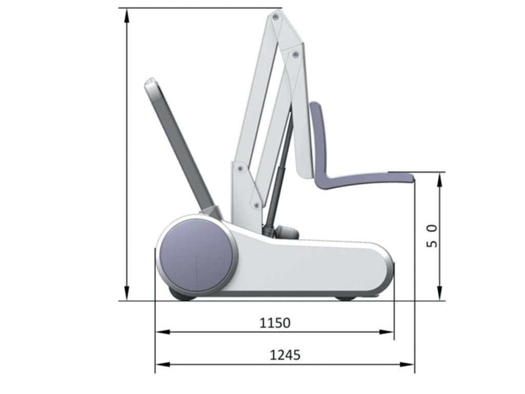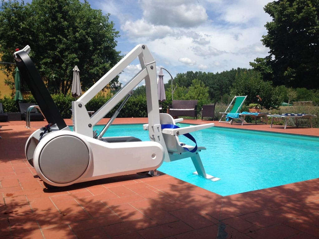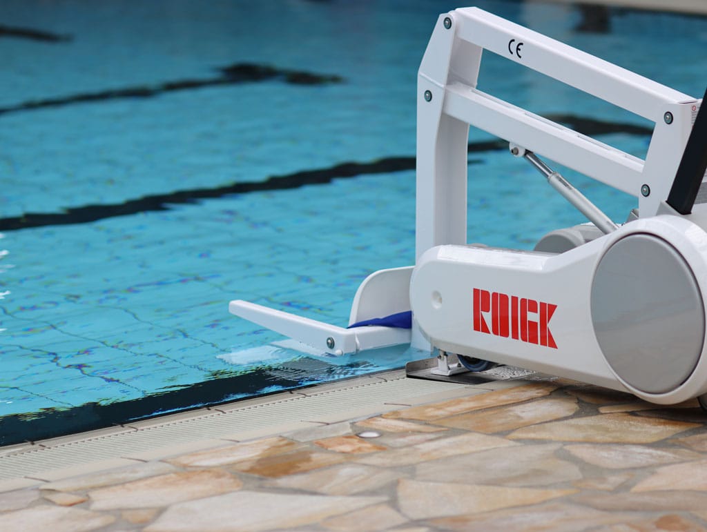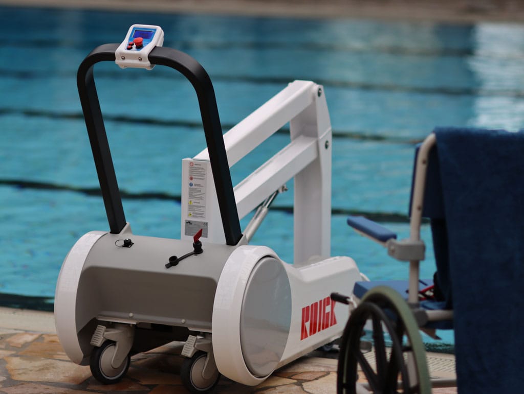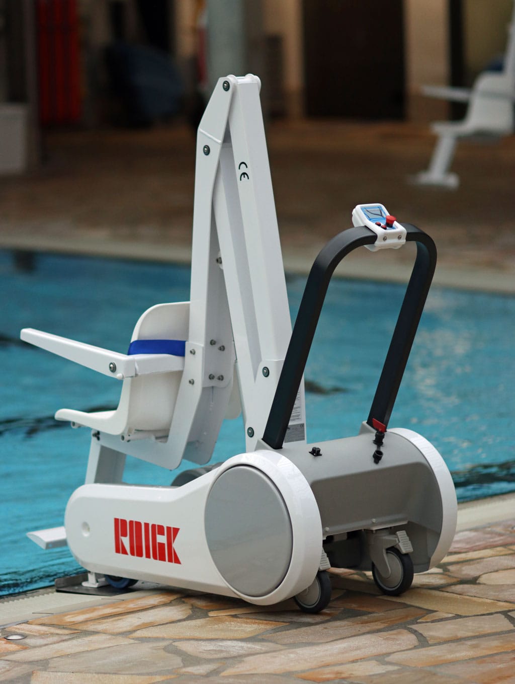 With control panel up/down, emergency stop button, digital display for charging status, two wheels with brake. Secure standing at the pool edge due to automatic electrical lowering lock at the front.