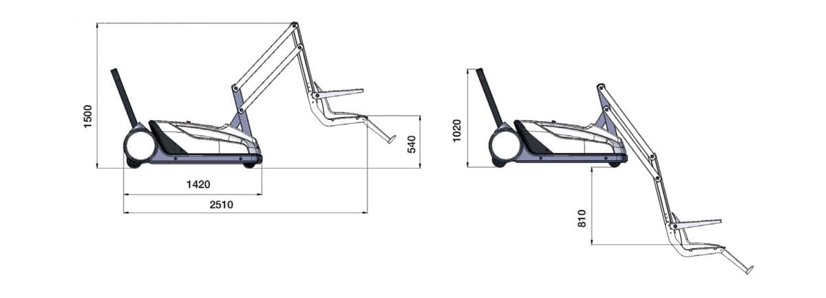 For independent operation by the user. Very light and therefore easy to roll. The further development of the swimming pool lift R36 enables the user to get in and out of the pool independently. The lifting arm can be turned sideways to the edge of the pool so that the user can easily transfer from a wheelchair or shower chair. By means of a remote control, the user can then move into and out of the water by himself. For wheelchair users with a high degree of independence. The lift requires no further attachment to the pool edge and can therefore be used flexibly at different points in the pool. With control panel up/down / right/left, emergency stop button, digital display for charging status, two wheels with brake.
