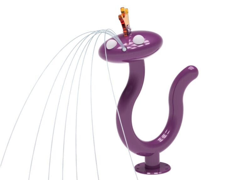 Fünf kraftvolle Wasserstrahlen tanzen in perfekter Choreografie aus dem elegant geschwungenen Edelstahlkörper und laden Kinder und Kleinkinder zu einem spritzigen, interaktiven Wassererlebnis ein.